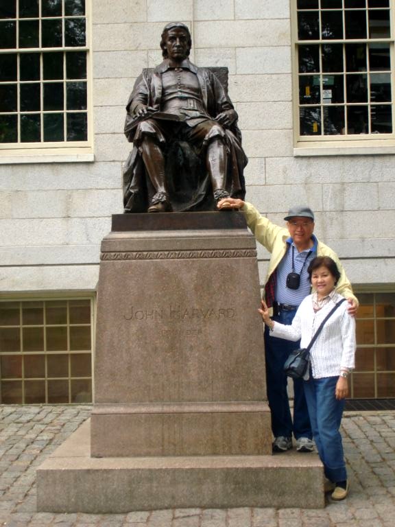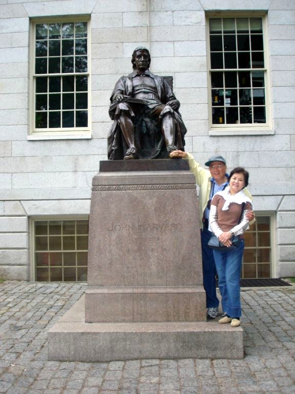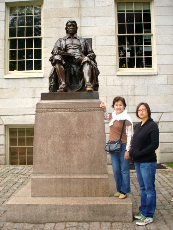 Rờ chân tượng đồng ông Harvard. Theo truyền thuyết các sinh viên Harvard muốn học giỏi, đổ đạt thành người, phải biết tôn thờ ông Harvard, và phải rờ chân tượng của ông, để được phò hộ. Chân ông Harvard chổ tôi rờ, bây giờ đổi màu, đồng đen thành vàng sáng ngời vì quá nhiều người đả rờ chân ông…