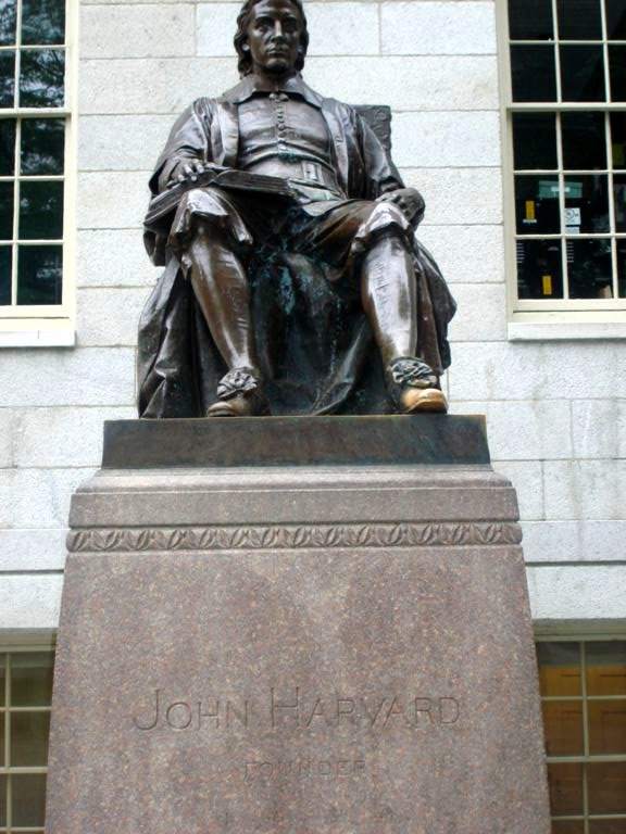 Trường Harvard lúc mới thành lập không có tên Harvard. Ông Harvard tặng nhà trường lúc bấy giờ 700 đô la và 400 cuốn sách. Ban quản trị nhà trường quyết định đổi tên trường thành trường Harvard. Tượng nầy vinh danh ông Harvard, ngồi ngó ra cổng trường, uy nghi, bệ vệ. Thế nhưng nhà điêu khắc không có hình của ông, nên đả lấy hình của sinh viên đầu tiên của trường để khắc tượng. Hiện nay dưới chân tượng vẩn đề John Harvard...
